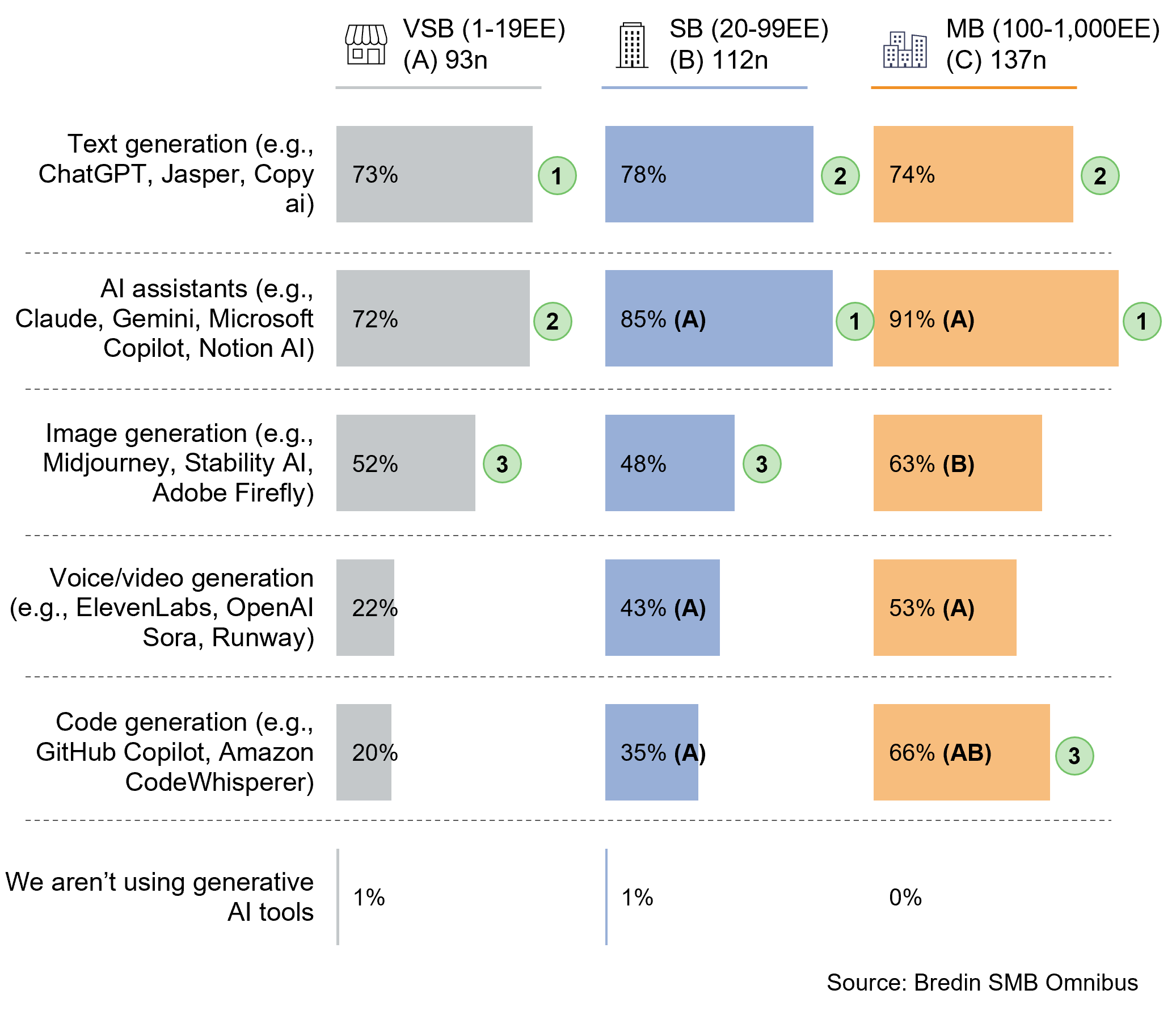 VSBs are most likely to use gen AI for text generation, followed by as an assistant. SBs and MBs use AI as an assistant first, followed by text generation.