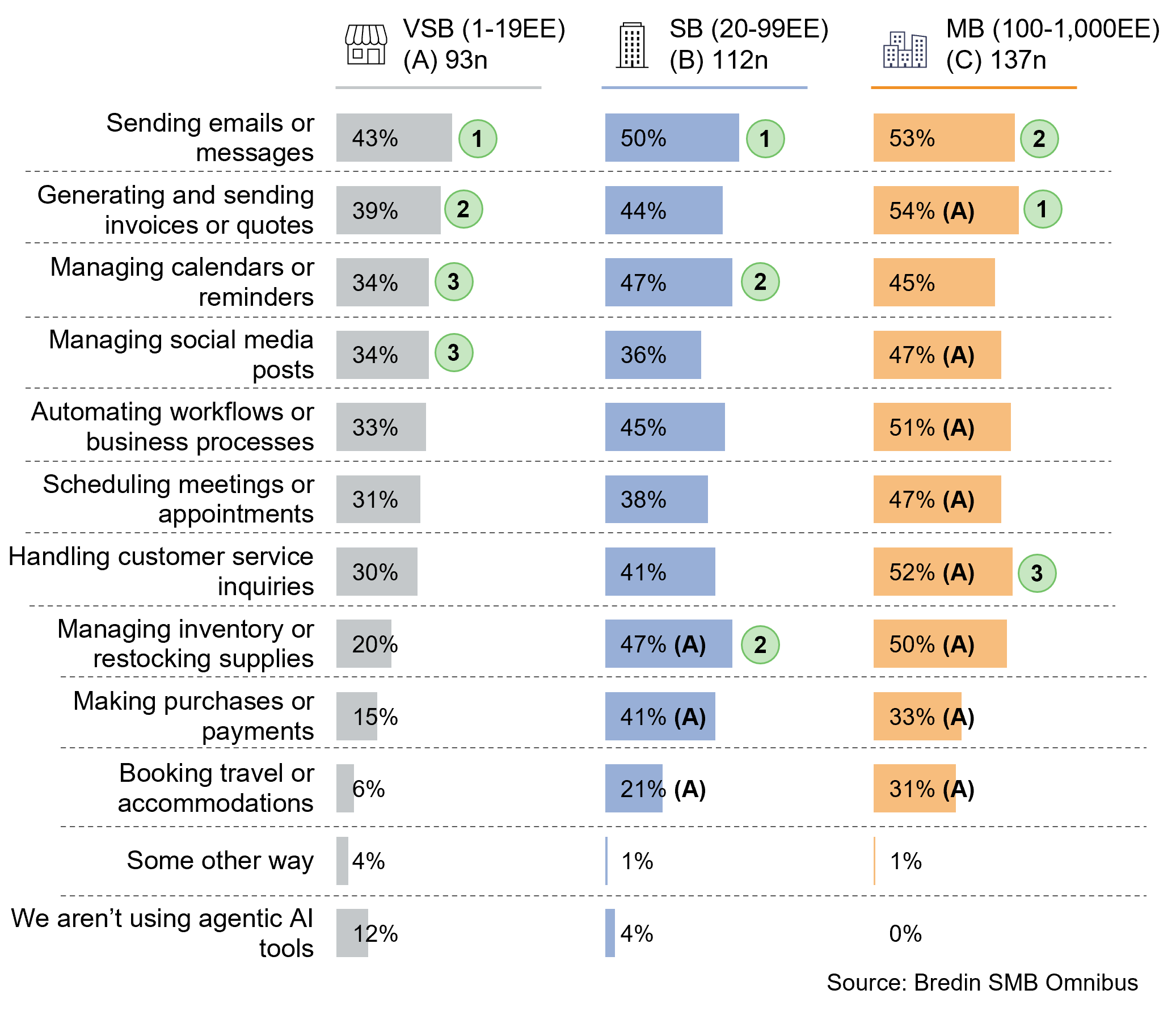 VSBs use agentic AI most for sending emails or messages, with invoicing next. SBs also prioritize email automation, followed by calendar and reminder management. MBs focus first on AI-driven invoicing or quoting, with email automation second.