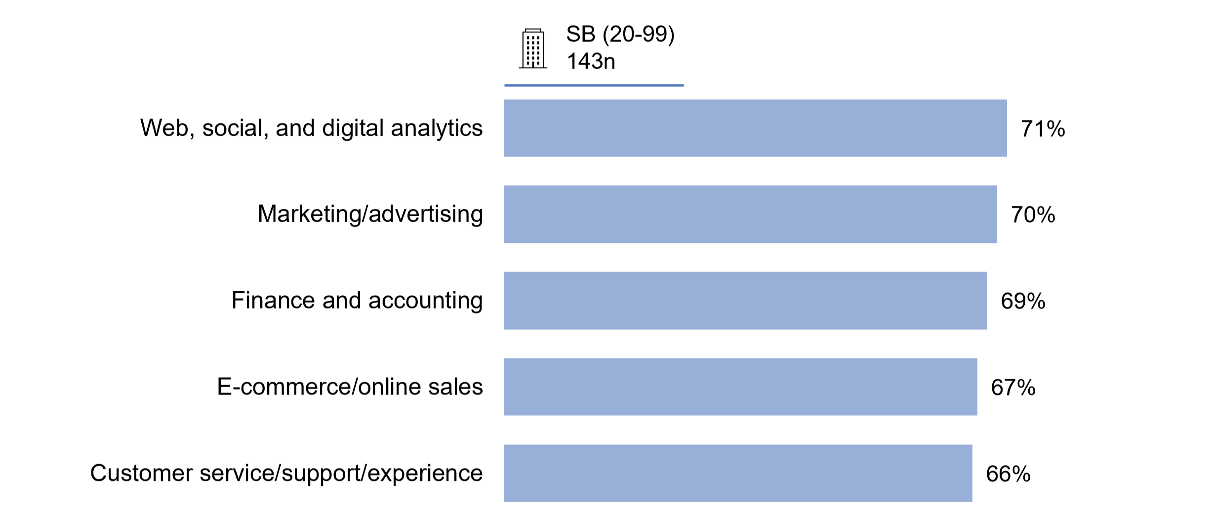 Web, social, and digital analytics lead the way. Across all company sizes, SMBs are using AI most to understand customer behavior, optimize campaigns, and measure the performance of their online presence.